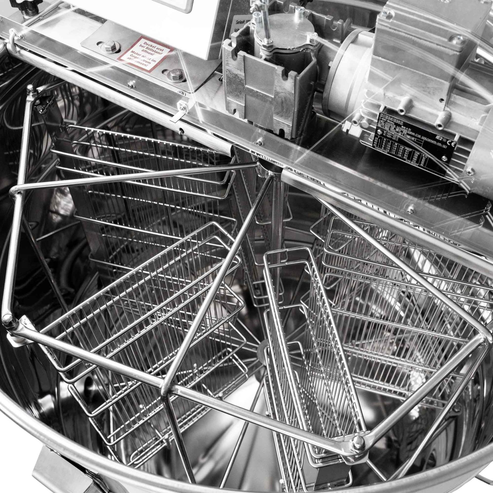 ⚠️ Die Steuerung und Deckelöffnung befinden sich zu Anschauungszwecken nach vorne gerichtet. Für eine einfachere Bestückung der Waben im Schleuderkorb erfolgt die Lieferung mit Steuerung und Deckelöffnung nach hinten.